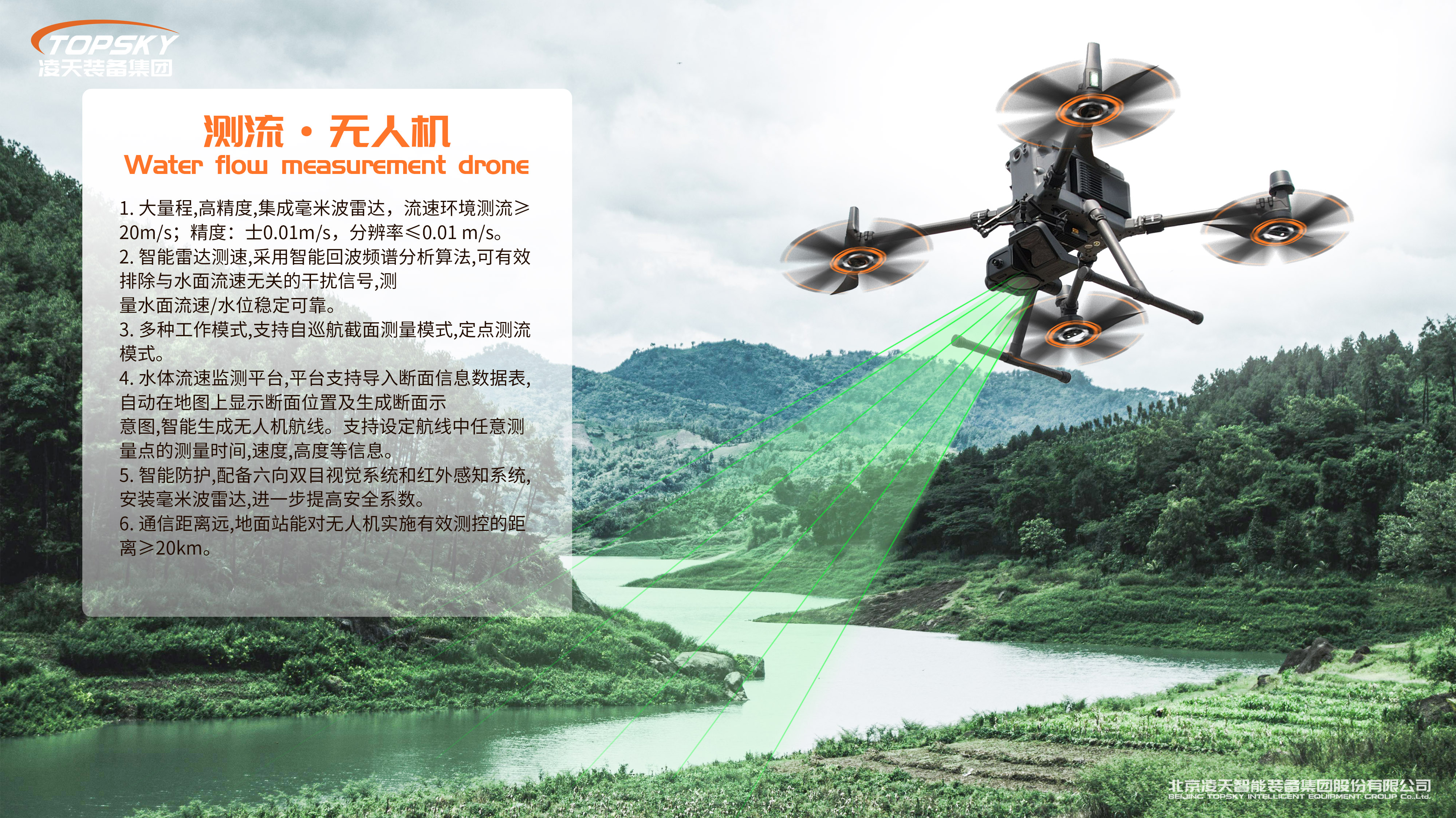测流无人机具备水体流速、流量监测等系统;用于暴雨洪水流动速度,特别是堤防溃口水流速度的快速探测。具备无人机水体流速、流量的监测系统,流速环境测流≥20m/s。