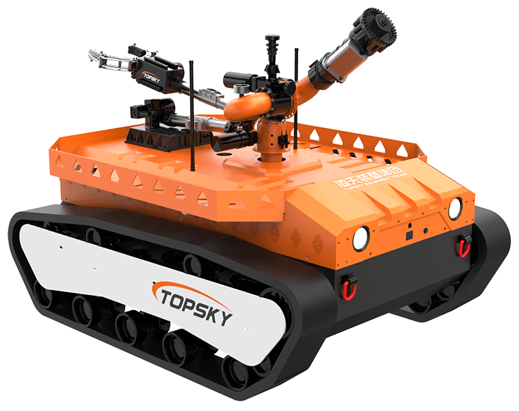 履带式防爆机器人底盘采用锂电池电源作为动力源,使用无线遥控的方式远距离操控,装载7自由度排爆机械手能实现不同角度旋转,机械臂可装载爆炸物销毁器,可现场摧毁爆炸物,采用履带+单摆臂结构,能适应各种地形快速作战部署。