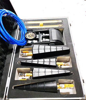 用于快速封堵背压≦0.1Mpa,泄漏介质温度≦60℃的存储罐、油罐车、液柜车裂缝,不需要拉伸带。操作人员堵漏时将枪头、枪杆、连接气管、脚踏气泵连接在一起,手持枪杆在安全距离外,将楔形或圆锥形密封袋插入于直径15至60毫米的裂缝里面,以及直径30至90毫米的漏孔内,并迅速充气密封裂缝。
