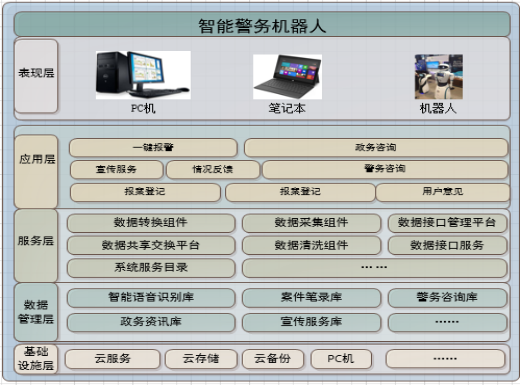 警务服务机器人总体涵盖一键报警、生活咨询、情况反馈、警务咨询、政务资讯、宣传服务、报案登记、用户意见八个功能模块,人机语音交互。同时解决“警力有限,民力无穷”,“人工智能+警务”的深化运用,智能警务机器人应运而生,不仅提高警务科技含量,也极大缓解警员警力不足、警务工作效率低、人民群众办事难的问题。