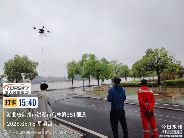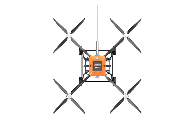 该无人机可装载在消防车上,能快速启动升空,通过特制高压水带与消防车水罐连接,消防车水罐内部高效泡沫/水基灭火剂输送到无人机平台,在水枪喷口水平喷射出去,达到灭火的效果。