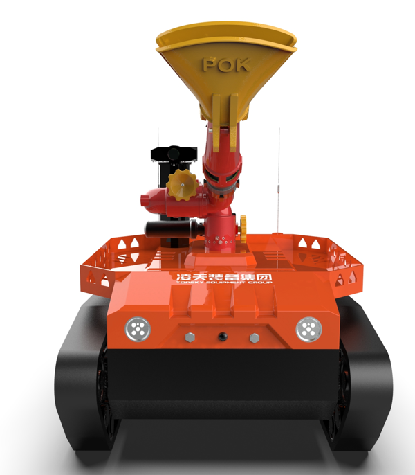 机器人采用无线遥控设计,遥控器与监视器一体/分离,可实时的显示电池、内部的各种信息,机器人状态、现场温湿度、有毒有害气体浓度报警信息等控制机器人前进、后退、转向等运动。具备远程侦察能力,机身搭建升降云台、高清摄像头、热成像摄像头、气体传感器三类环境感知设备和云台控制设备,也可联动声光报警模块提醒消防人员或群众,有效避免危险。在通过远程侦察手段有效获取现场火源信息后,机器人配备的大功率电机可以帮助消防人员将消防水袋拖拽至危险火源区域进行灭火,并能搭载各类国内、外的多种消防水泡,并能够远程控制发射水或泡沫。基于所配备的拾音模块和扬声器模块,拾取现场环境声音,即使消防官兵未靠近消防现场也能够听到搜救现场的群众呼救声,并通过扬声器模块与群众进行现场对话。