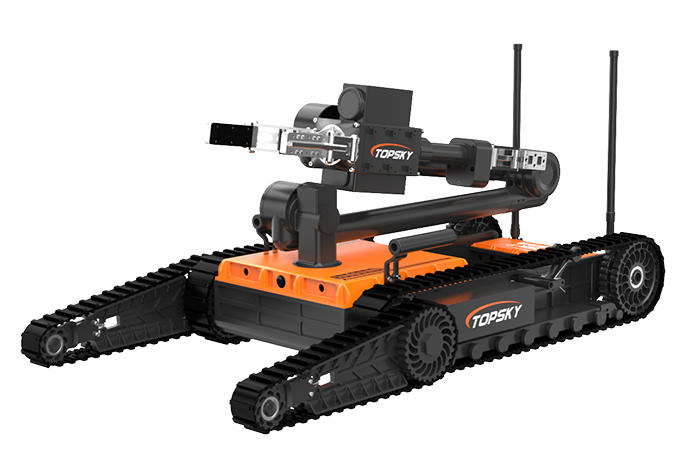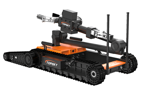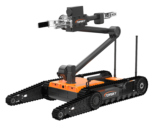 排爆机器人主要是用来处理爆炸物相关工作的排爆式机器人,也可用于侦察人难以达到的地形的一种机器人。7自由度排爆机械手能实现不同角度旋转,近端最大可抓举16KG的重物,小手爪可抓取3KG重物,机械臂可装载爆炸物销毁器,可现场摧毁爆炸物,底盘采用履带+单摆臂结构,能适应各种地形快速作战部署。同时机器人配备有线控制可以网络干扰情况下通过有线远距离作业。排爆机器人可与配件一同使用,包括销毁器(例如29mm),爆炸物的远程引爆控制系统等。