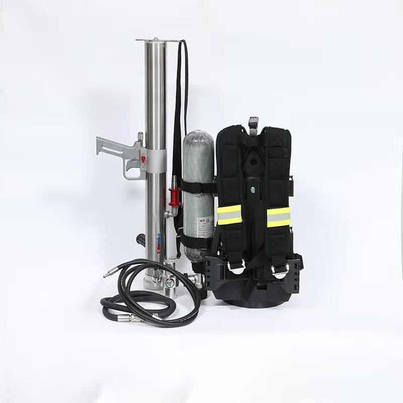 本装置是将空气呼吸器和细水雾灭火装置进行有机组合,既能满足灭火操作人员方便携带进入火灾现场进行灭火,又能满足呼吸需要,且重量配置合理具有背负舒适,操作简单,维护方便等特点。