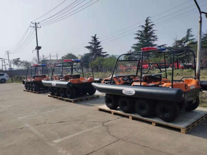 在复杂恶劣的地形条件和自然环境下,水陆两栖全地形车可以让搜救队员和携带的救援装备快速到达救援现场,减少徒步带来提供消耗,完成最后一公里最好五分钟紧急救援任务。水陆两栖全地形车可配备点到绞盘、救援担架组件、探照灯、警示灯、警报器、脱钩、破拆工具等装备, 给救援团队提供救援保障,更安全的解救伤员和疏散群众。