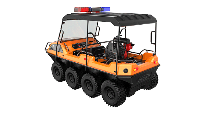 在复杂恶劣的地形条件和自然环境下,森林消防水陆两栖全地形车可以让搜救队员和携带的救援装备快速到达救援现场,减少徒步带来提供消耗,完成最后一公里最好五分钟紧急救援任务。森林消防水陆两栖全地形车可配备点到绞盘、救援担架组件、探照灯、警示灯、警报器、脱钩、破拆工具等装备, 给救援团队提供救援保障,更安全的解救伤员和疏散群众。