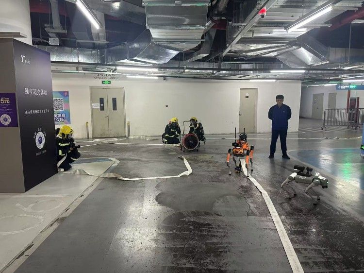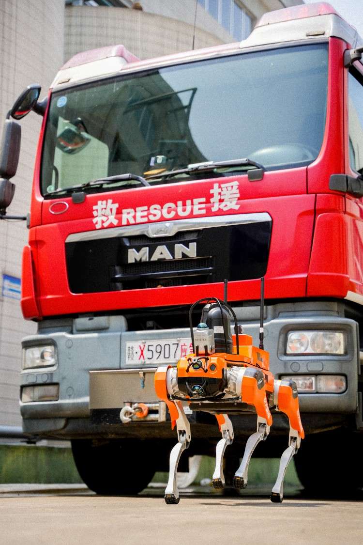 四足机器人搭载4D激光雷达,360°×90°半球超广角感知能力,超低盲点,可以做出跳跃、伸展、握手、高兴、跳人、坐下等手势; 内置长续航电池,满足消防侦察救援需求。