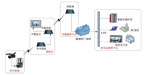 前端现场采集车安装大功率车载设备在城市各区内巡逻,实时将采集的音视频信息传给就近接收点,接收点用微波、光纤或专网等设施传输给指挥中心。